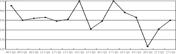 2022年一季度,安防企业科技投入景气指数为150,与上季度持平,比去年同期上升了9个百分点,位于"较强景气区间"(见图10)。其中,有57%的企业继续增加了科技研发资金的投入,有36%的企业科研投入与上季度持平,有7%的企业投入下降。