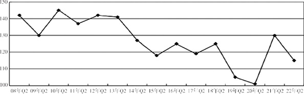 2022年四季度,外贸出口景气指数为100,比上季度下降了5个百分点,与去年同期相比下降了3个百分点,位于"微景气区间"(见图35)。其中,有33%的调查企业国外订单有了新的增长,比上季度上升了7个百分点;有34%的企业反映销售"持平",比上季度下降了19个百分点;有33%的企业反映"下降",比上季度上升了12个百分点。